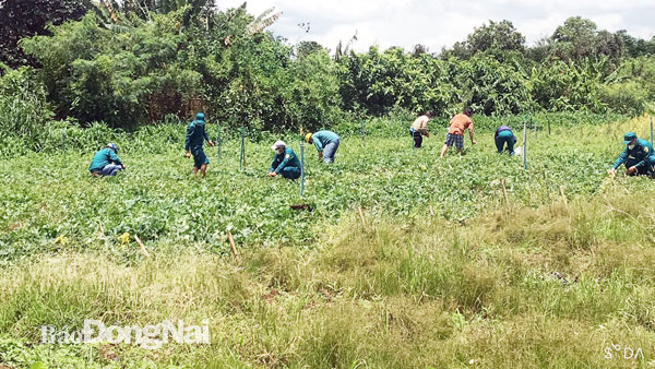 | Lực lượng dân quân xã Gia Tân 1 đang thu hoạch rau để phát cho người dân trên địa bàn xã. Ảnh: Hữu Thắng |