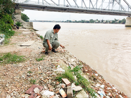 | Hộ ông Nguyễn Ngọc Điệp tốn vài chục triệu đồng để đổ xà bần kè sông, giữ đất. |