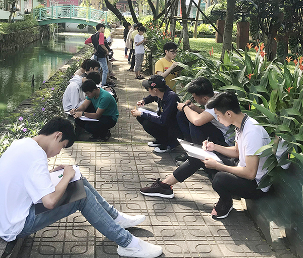 | Người dân đến tập thể dục buổi sáng tại Công viên Biên Hùng (ảnh 1) và một buổi học thực tế của sinh viên Trường cao đẳng mỹ thuật Đồng Nai tại Công viên Biên Hùng (ảnh 2). |