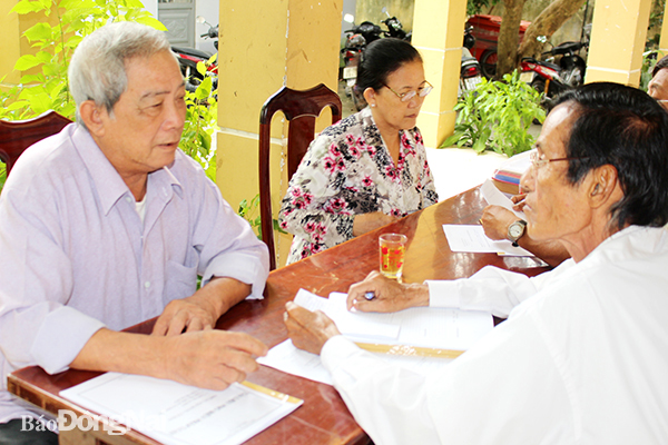 | Luật gia Lê Văn Nhân, Hội Luật gia tỉnh (phải) tư vấn về quyền định đoạt tài sản chung của vợ chồng cho người dân ở xã Phú Thạnh (H.Nhơn Trạch). Ảnh chụp vào tháng 6-2020 |