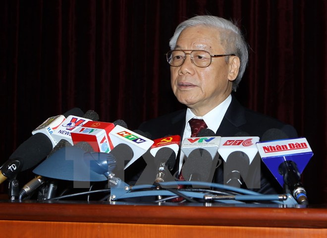 | Tổng Bí thư Nguyễn Phú Trọng phát biểu bế mạc Hội nghị Ban Chấp hành Trung ương Đảng Khóa XI, lần thứ 11. (Ảnh: TTXVN) |