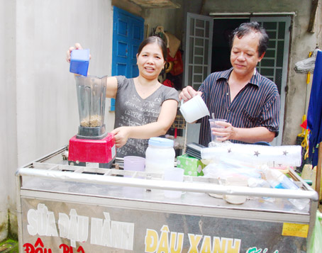 | Bà Đinh Thị Thu Vân (ngụ ấp Suối Rút, xã Phú Túc, huyện Định Quán) cùng chồng chuẩn bị xay đậu nành để bán. Chiếc máy làm đậu nành bà Vân mua được từ tiền của dự án hỗ trợ vốn cho hộ nghèo mua phương tiện sản xuất, kinh doanh của Quỹ Vì người nghèo huyện Định Quán. Ảnh: VĂN TRUYÊN |