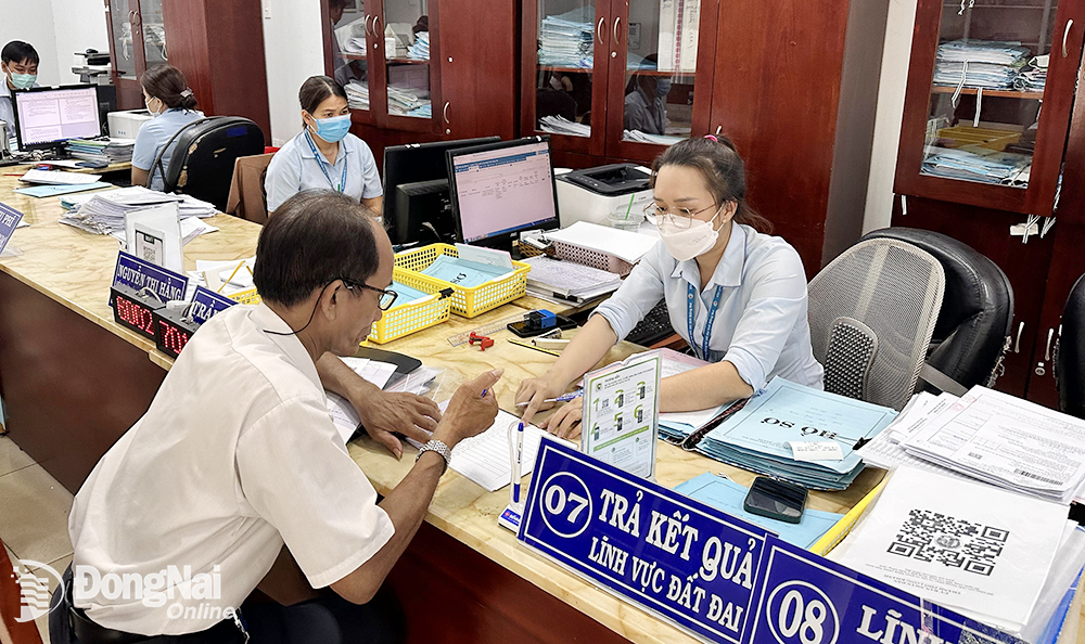 | Cán bộ công chức bộ phận một cửa TP.Long Khánh phục vụ người dân đến giải quyết thủ tục hành chính. Ảnh: C.Nghĩa |