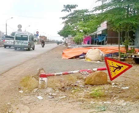Trong ảnh là biển báo giao thông đường bộ đặt trên quốc lộ 1, đoạn qua ấp An Hòa, xã Tây Hòa (huyện Trảng Bom) cho biết phía trước có đường dành cho người đi bộ. Tuy nhiên, hơn 1 tháng nay biển báo này bị đổ nằm chỏng chơ bên vệ đường nhưng đến nay chưa thấy đơn vị chủ quản đến khắc phục, sửa chữa (ảnh chụp ngày 23-8-2016).