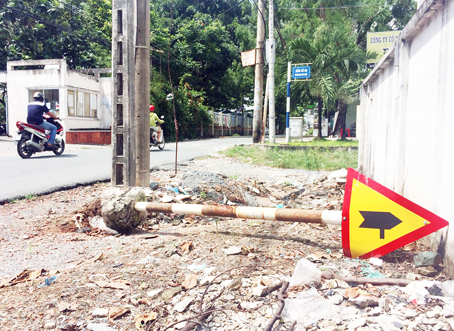 Cách đây nhiều ngày biển báo bị “bật gốc”, nằm đổ bên vệ đường nhưng đơn vị chức năng vẫn chưa khắc phục. Đây là đoạn đường có nhiều học sinh qua lại và có nhiều điểm giao cắt với đường hẻm nhỏ, nếu không sớm khắc phục thì các phương tiện không biết phía trước là gì nên rất nguy hiểm (ảnh chụp ngày 10-7-2017).