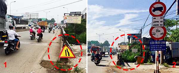 Báo Đồng Nai ngày 22-10 phản ánh một biển báo giao thông báo hiệu cho biết phía trước là đoạn đường hẹp nguy hiểm theo phía bên phải nhưng lại nằm ở dưới lan can cầu Suối Linh (phường Tam Hiệp, TP.Biên Hòa) - (ảnh 1).