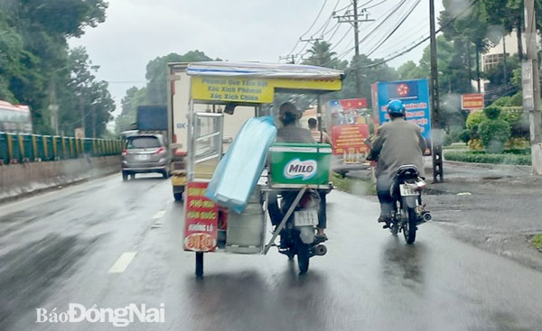 Một người đàn ông điều khiển xe máy tự chế biển số 39F4-5792 ngang nhiên lưu thông trên tuyến quốc lộ 1 (đoạn qua TT.Trảng Bom, H.Trảng Bom), hướng từ ngã tư Dầu Giây đi TP.Biên Hòa. Điều đáng nói, chiếc xe này còn được gắn một cái tủ có bánh xe, phía trên tủ đựng thức ăn, phía dưới đựng một bình gas cỡ lớn nhưng vẫn lao vun vút trên đường, đi cả vào làn đường dành cho xe ô tô rất nguy hiểm.