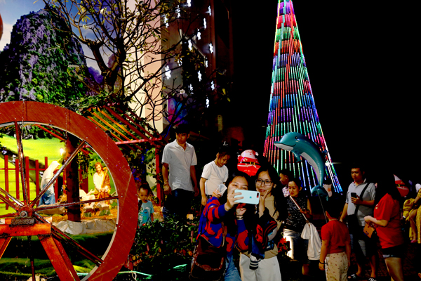 | Người dân vui chơi bên cây thông Noel tại Trung tâm thương mại Vincom |