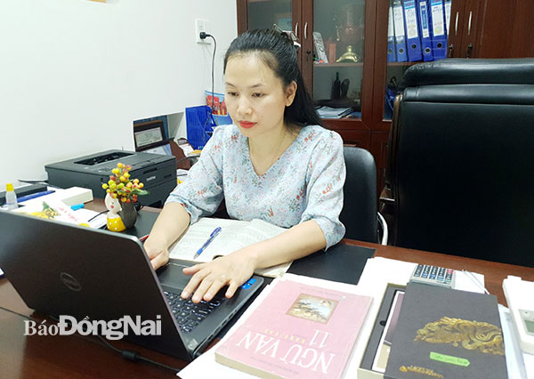 | Cô Nguyễn Thị Thu Hà, Tổ trưởng Tổ Ngữ văn, Trường THPT chuyên Lương Thế Vinh (TP.Biên Hòa) đang dạy học trực tuyến. Ảnh: NVCC |