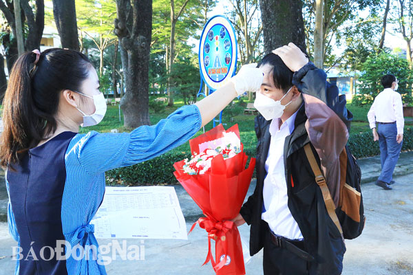 | Để học sinh trở lại học trực tiếp, các trường phải tuân thủ các quy định phòng, chống dịch. Trong ảnh: Học sinh Trường THPT Thống Nhất A (H.Trảng Bom) mang hoa đến tặng cô giáo trong ngày đầu trở lại trường |