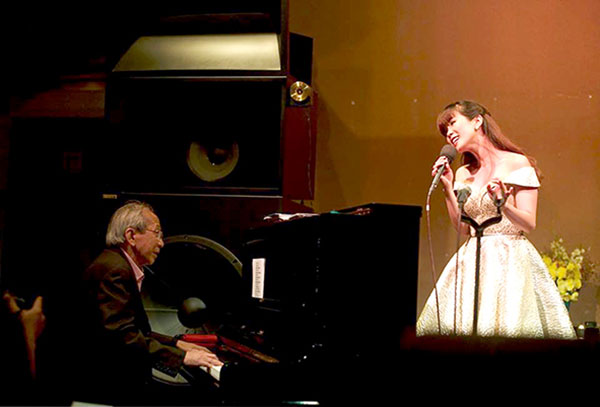 | Cố nhạc sĩ Nguyễn Ánh 9 đệm đàn cho ca sĩ Nguyễn Vũ Diệu Hiền hát. Ảnh: NVCC |