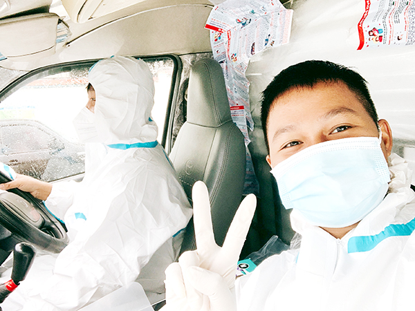 | Sinh viên Lê Trần Quyết Tâm (bên phải) trong một lần chuẩn bị chở F0 đi cách ly điều trị. Ảnh: NVCC |