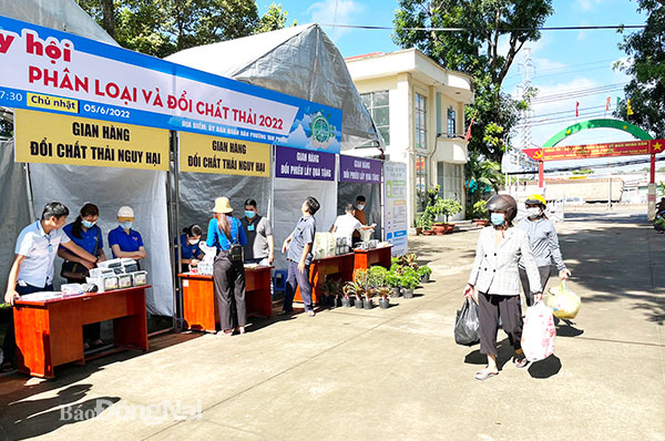 | Ngày hội Phân loại chất thải và đổi chất thải lấy quà tại P.Tam Phước (TP.Biên Hòa) được nhiều người dân tham gia. Ảnh: Khắc Thiết |