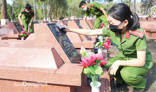 | Các cán bộ Công an TP. Long Khánh chăm sóc, lau chùi những ngôi mộ liệt sĩ tại Nghĩa trang liệt sĩ TP.Long Khánh. Ảnh: Huy Anh |