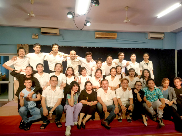 | Nghệ sĩ Hữu Châu (hàng đầu, thứ 2 từ trái qua) trong buổi thi cuối khóa của lớp học đào tạo diễn viên sân khấu Hoàng Thái Thanh |