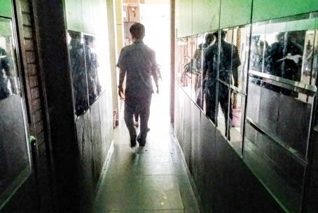 | Lối đi lại trong một quán karaoke tương đối nhỏ, chỉ 2 người chen nhau đi vừa |