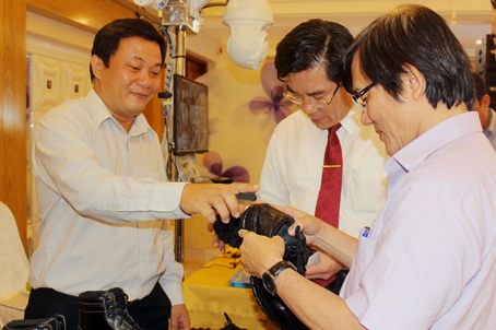 | Ông Nguyễn Công Dương (bìa trái) giới thiệu sản phẩm tại hội nghị giao thương với doanh nghiệp FDI Đài Loan do Đồng Nai tổ chức. Ảnh: B.Nguyên |