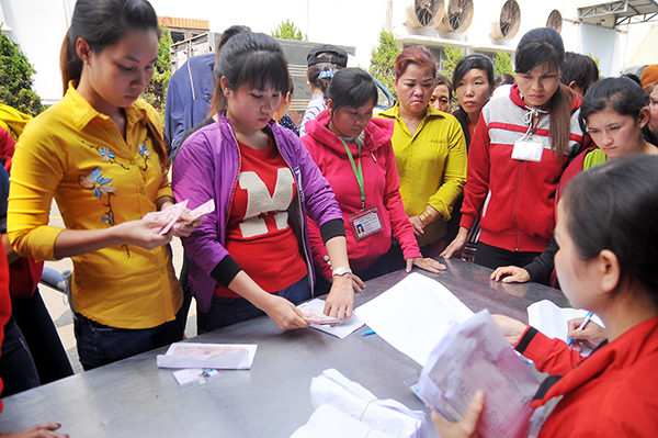 | UBND tỉnh phải trích ngân sách chi trả cho công nhân khi chủ Công ty TNHH KL Texwell Vina ở Khu công nghiệp Bàu Xéo (huyện Trảng Bom) bỏ trốn. Trong ảnh: Công nhân Công ty TNHH KL Texwell Vina nhận tiền trợ cấp. Ảnh: K.MINH |