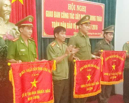 | Đại tá Bùi Hữu Danh, Phó giám đốc Công an tỉnh, tặng cờ thi đua xuất sắc cho đại diện Công an xã An Viễn (thứ 2, từ phải qua). |
