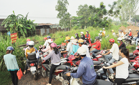 | Hàng trăm người (chủ yếu là công nhân) xếp hàng chờ qua đường ngang dân sinh được mở bất hợp pháp đoạn qua KP.8, phường Long Bình, TP.Biên Hòa. |