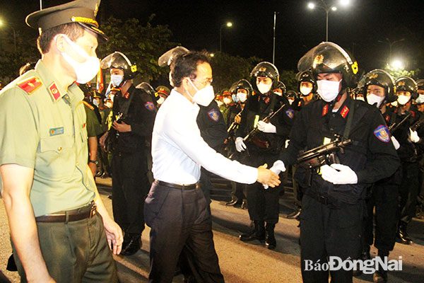 | Lãnh đạo Thành ủy TP.Biên Hòa động viên lực lượng công an ra quân thực hiện cao điểm tấn công trấn áp tội phạm đảm bảo an ninh trật tự dịp Tết Nguyên đán Nhâm Dần 2022. Ảnh: Trần Danh |