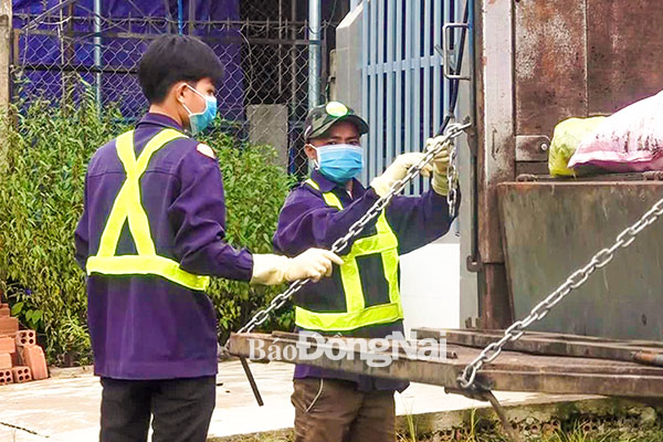 | Các thành viên Tổ hợp tác thu gom rác của Đoàn xã Thanh Sơn (huyện Tân Phú) kiểm tra xe, bàn nâng trước khi đi làm. Ảnh: M.THÀNH |