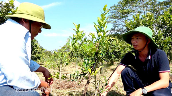 | Hai anh Lê Kim Tiến và Nguyễn Văn Hiệp đang kiểm tra khu vườn trồng chanh Thái rộng 5ha tại ấp 6, xã Bàu Cạn (H.Long Thành). Ảnh: T.Nhân |