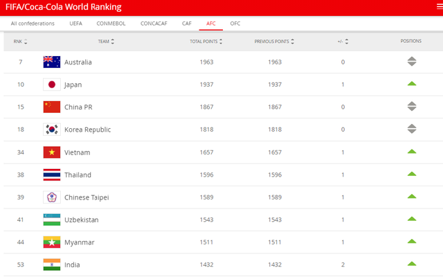Trong tốp 10 khu vực châu Á, đội tuyển nữ Australia (hạng 7 thế giới), Nhật Bản (hạng 10), Trung Quốc (hạng 15), Hàn Quốc (hạng 18), Việt Nam (hạng 34), Thái Lan (hạng 38), Đài Loan (hạng 39), Uzbekistan (hạng 41), Myanmar (hạng 44) và Ấn Độ (thứ hạng 53).