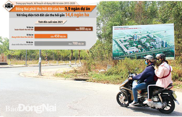 Theo UBND tỉnh, trong quy hoạch, kế hoạch sử dụng đất từ năm 2015-2020, Đồng Nai phải thu hồi đất của hơn 1.980 dự án với tổng diện tích đất cần thu hồi gần 14,6 ngàn ha. Tuy nhiên, đến cuối năm 2021, mới có hơn 800 dự án hoàn thành thu hồi đất, gần 450 dự án đang triển khai công tác thu hồi đất và hơn 700 dự án chưa triển khai.
