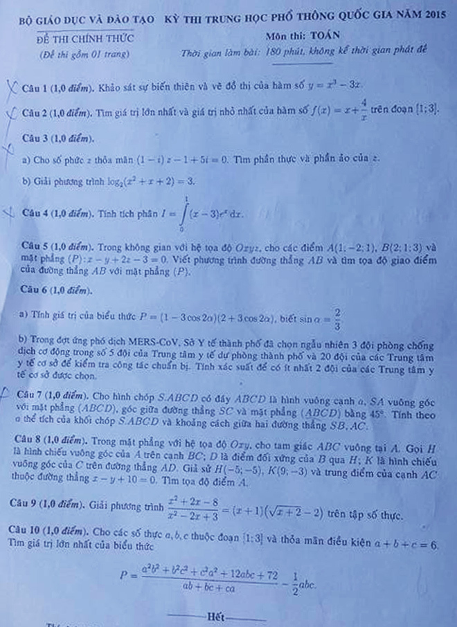 Tại điểm thi Cao đẳng du lịch Hà Nội (Hội đồng thi Học viện Kỹ thuật quân sự), hết 2/3 thời gian đã có lác đác thí sinh ra khỏi phòng. Nguyễn Công Tú, học sinh trường Xuân Đỉnh (Bắc Từ Liêm), cho biết làm bài chỉ hết 90 phút. Đề thi Toán chủ yếu rơi vào phần kiến thức lớp 12 và tương đương với đề thi minh họa của Bộ Giáo dục và Đào tạo. Học sinh trung bình có thể làm được 5 điểm, đủ sức để tốt nghiệp. "Em làm được 9 câu, còn câu số 10 rơi vào phần tính giá trị biểu thức, do không nắm chắc nên bỏ không làm. Trừ các lỗi, em được khoảng 8 điểm", thí sinh này tự tin nói.