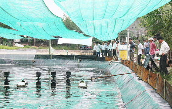 | Nông dân tham quan mô hình thí điểm nuôi tôm công nghệ cao tại huyện Nhơn Trạch. |