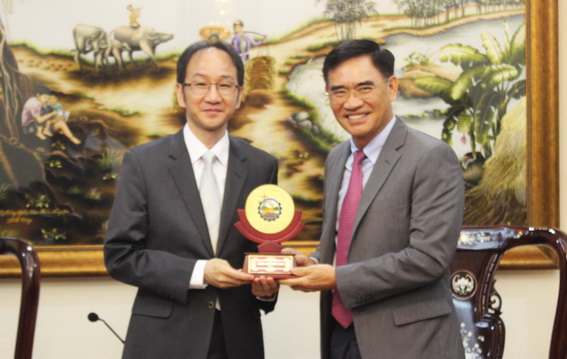 | Phó chủ tịch UBND tỉnh Trần Văn Vĩnh tặng quà cho ông Chung Wen Cheng, Chủ nhiệm Văn phòng Kinh tế- văn hóa Đài Bắc tại TP.Hồ Chí Minh. |