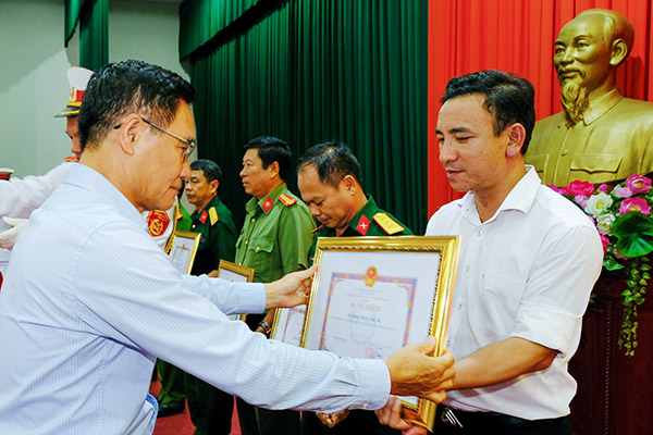 | Phó chủ tịch UBND tỉnh Nguyễn Quốc Hùng tặng bằng khen cho 48 cá nhân có thành tích xuất sắc trong thực hiện diễn tập khu vực phòng thủ năm 2019. |