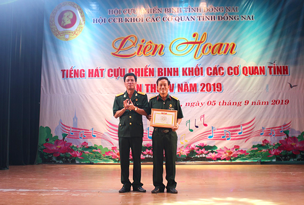 | Chủ tịch Hội CCB khối các cơ quan tỉnh Trần Văn Giới trao giải nhất tập thể cho đơn vị Hội CCB Sở TN&MT |