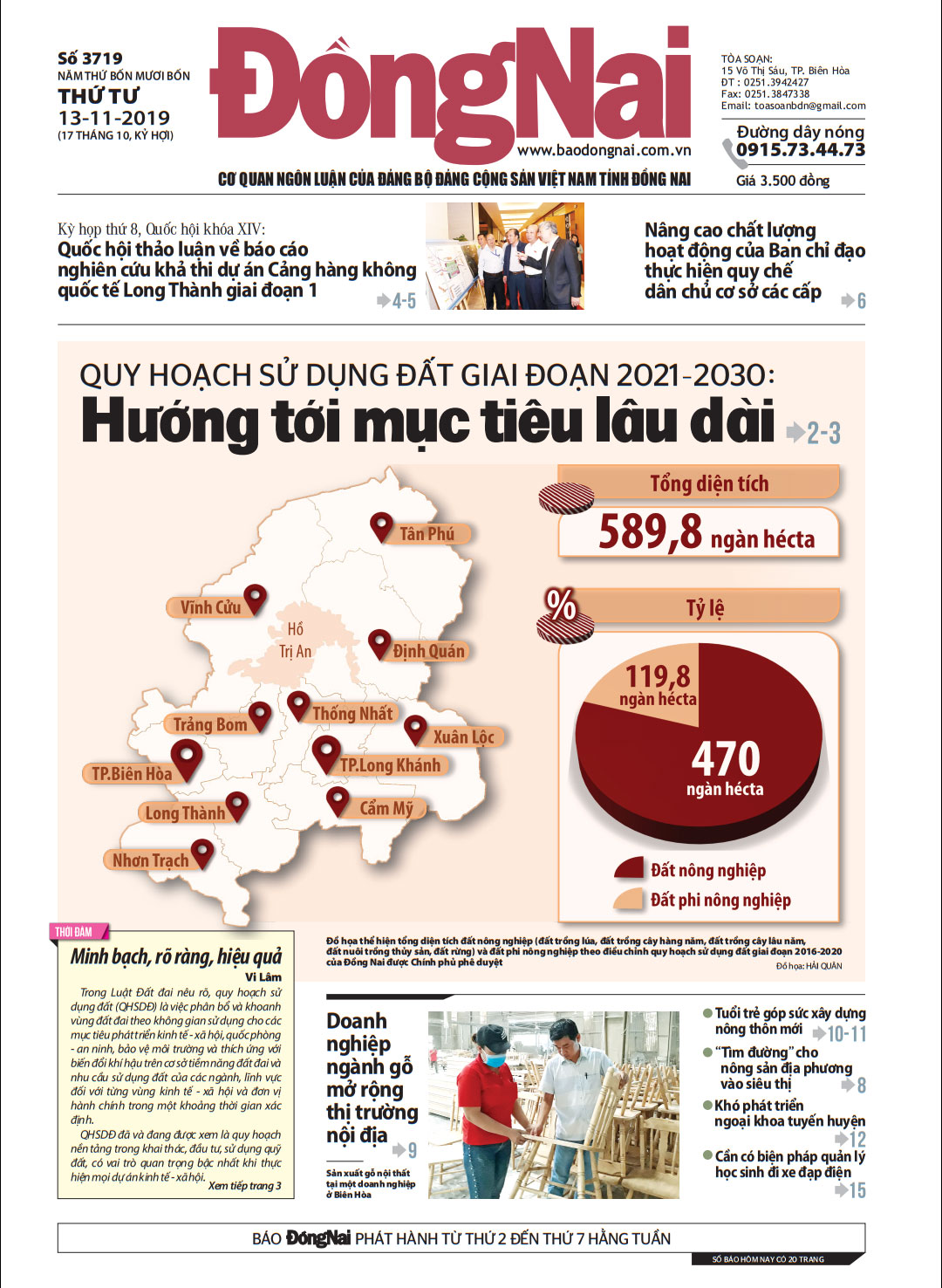 Tin tức về quy hoạch sử dụng đất cấp tỉnh giai đoạn 2021-2030; tình trạng học sinh đi xe đạp điện không đảm bảo an toàn; nông sản địa phương khó vào siêu thị; y tế tuyến huyện khó phát triển ngoại khoa... là những nội dung nổi bật trên Báo Đồng Nai số 3719 ra ngày 13-11-2019.