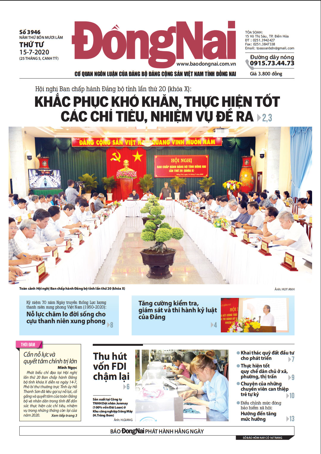 Những nội dung tại Hội nghị Ban chấp hành Đảng bộ tỉnh lần thứ 20 (khóa X); dòng vốn FDI vào Đồng Nai đã chậm lại; TP.Biên Hòa khai thác quỹ đất để đầu tư cho phát triển; mức đóng BHXH được điều chỉnh từ 15-7… là những nội dung nổi bật trên Báo Đồng Nai số 3946 ra ngày 15-7-2020.