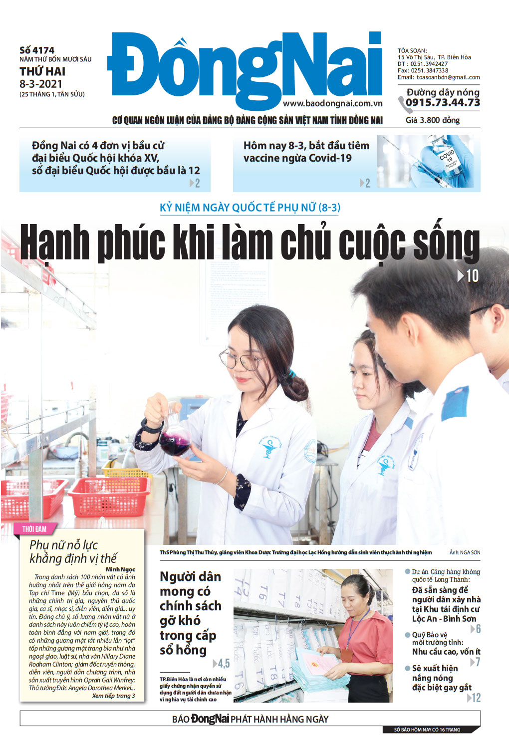 Người dân mong có chính sách hỗ trợ trong việc cấp sổ hồng; đã có thể xây nhà tại Khu tái định cư Lộc An - Bình Sơn; phụ nữ làm chủ cuộc sống, xây dựng hạnh phúc; dự báo thời tiết mùa khô năm nay; phóng sự truyền hình về phụ nữ dân tộc vượt khó, đóng góp cho cộng đồng... là những nội dung nổi bật trên Báo Đồng Nai số 4174 ra ngày 8-3-2021 và website Báo Đồng Nai Online.