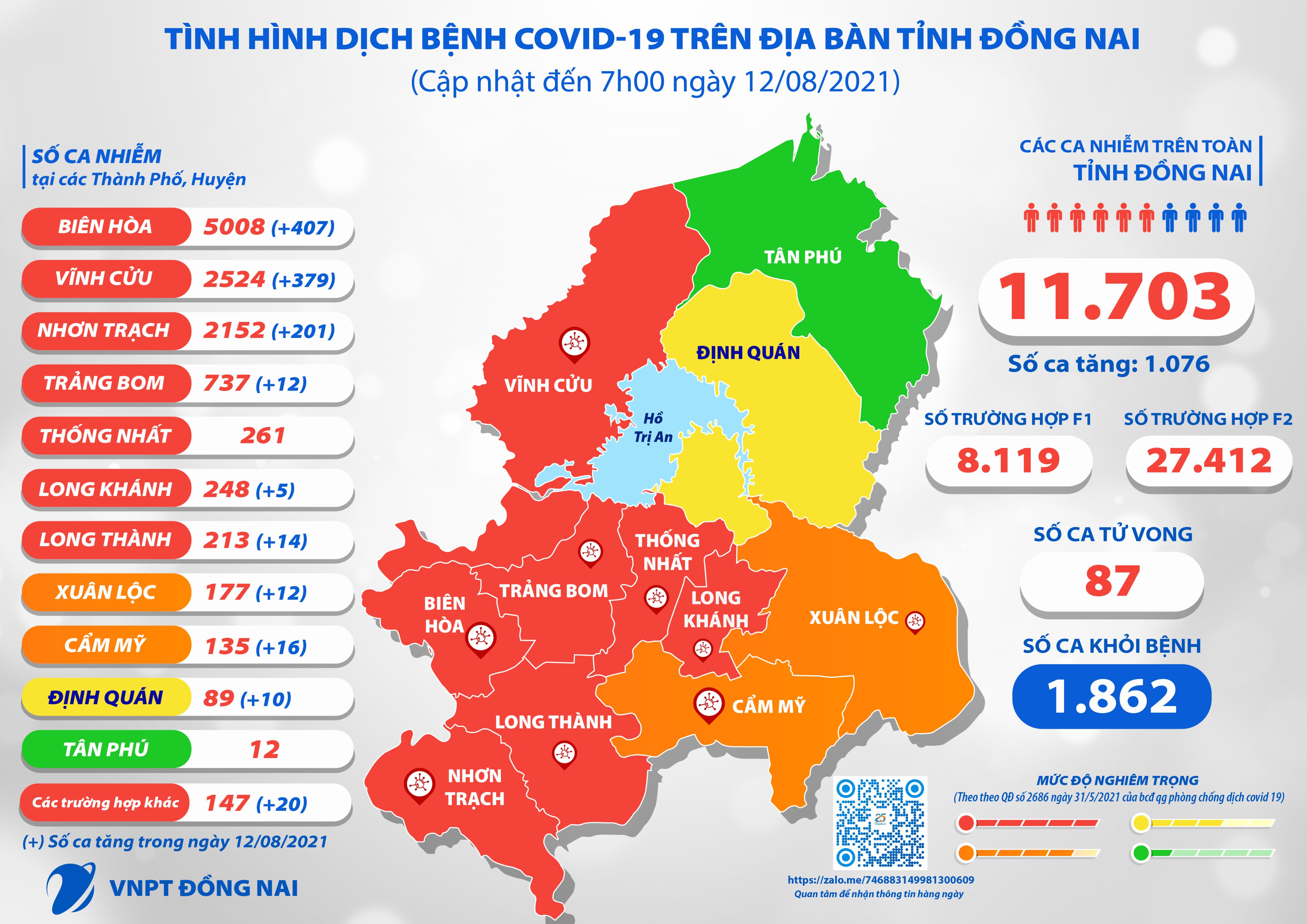 Tổng số ca dương tính với Covid-19 trong đợt dịch thứ 4 là 11.703 ca, cộng dồn 11.735 ca, riêng TP.Biên Hòa nhiều nhất với hơn 5 ngàn ca. Số ca tử vong do Covid-19 đến 22 giờ ngày 11-8 trên toàn tỉnh là 84 ca.