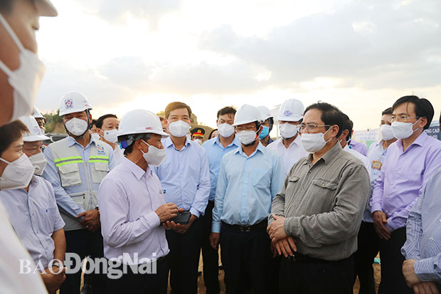 | Thủ tướng Chính phủ Phạm Minh Chính nghe đơn vị thi công trình bày những khó khăn trong thi công dự án Phan Thiết - Dầu Giây. Ảnh: Huy Anh |