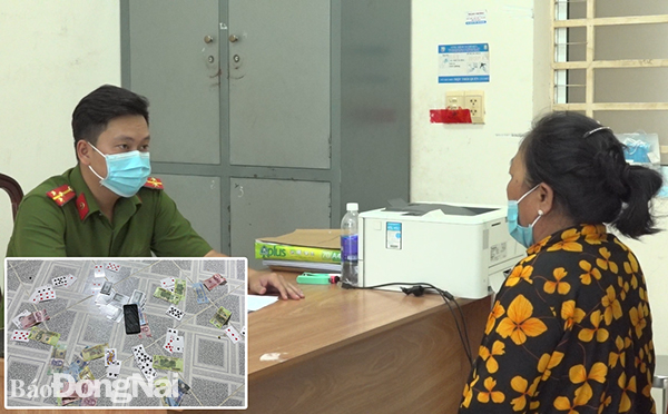 | Công an lấy lời khai đối tượng Dương Thị Nhàn (ảnh lớn) và tang vật trên chiếu bạc tại phòng trọ của Nhàn (ảnh nhỏ) |