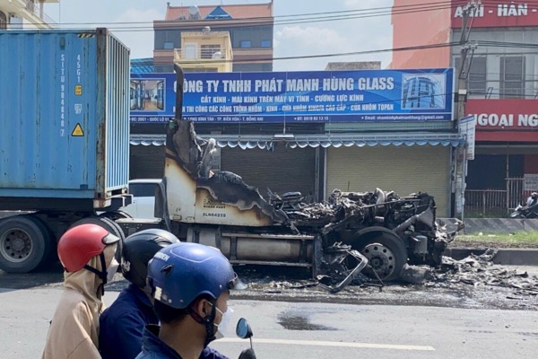 | Hiện trường vụ cháy xe đầu kéo trên quốc lộ 51 (P.An Hòa, TP.Biên Hòa) sáng 19-6. Ảnh: CTV |