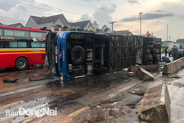 (ĐN) - Chiều 21-6, trên quốc lộ 1 (đoạn gần lối vào cao tốc Long Thành - Dầu Giây), đoạn qua KP.Trần Hưng Đạo (TT.Dầu Giây, H.Thống Nhất) xảy ra một vụ lật xe khách biển số 86B-009.88. Theo thông tin ban đầu, khoảng 14 giờ ngày 21-6, xe khách biển số 86B-009.88 (loại 52 chỗ của nhà xe M.N.) lưu thông trên quốc lộ 1 (hướng TP.Long Khánh - H.Thống Nhất) tới khu vực trên bất ngờ lao vào dải phân cách. Sự cố đột ngột đã khiến nhiều khối bê tông của dải phân cách văng khắp đường, chiếc xe 52 chỗ bị lật ngang sang chiều đường ngược lại.