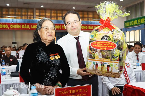 | Bí thư Thành ủy, Chủ tịch HĐND TP.Long Khánh Hồ Văn Nam tặng hoa và quà cho mẹ VNAH Đặng Thị Huấn |