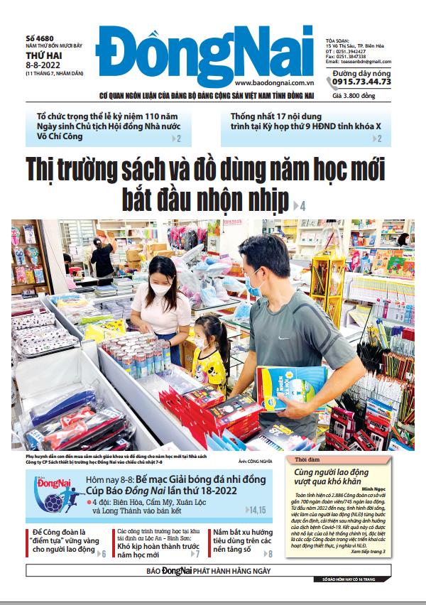 Các công trình trường học tại khu tái định cư Lộc An - Bình Sơn: Khó kịp hoàn thành trước năm học mới; Thị trường sách và đồ dùng năm học mới bắt đầu nhộn nhịp; Hôm nay 8-8: Bế mạc Giải bóng đá nhi đồng Cúp Báo Đồng Nai lần thứ 18-2022; Nắm bắt xu hướng tiêu dùng trên các nền tảng số; Sớm di dời người dân khỏi vùng “xôi đỗ”về mặt bằng để đảm bảo an toàn… là những nội dung nổi bật trên Báo Đồng Nai số 4680 ra ngày 8-8-2022 và website Báo Đồng Nai.