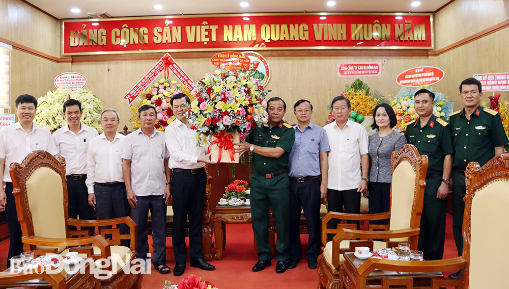 | Bí thư Tỉnh ủy Nguyễn Hồng Lĩnh và đoàn công tác tặng hoa, động viên chúc mừng cán bộ chiến sĩ lực lượng vũ trang tỉnh |
