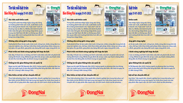 Xúc tiến xuất khẩu xanh; Những nhà nông giỏi công nghệ; Phát triển mô hình nông nghiệp kết hợp du lịch; Chống ùn tắc giao thông trên các quốc lộ; Bảo hiểm xã hội nỗ lực chuyển đổi số … là những nội dung nổi bật trên Báo Đồng Nai số 4848 ra ngày 30-1-2023 và website Báo Đồng Nai.