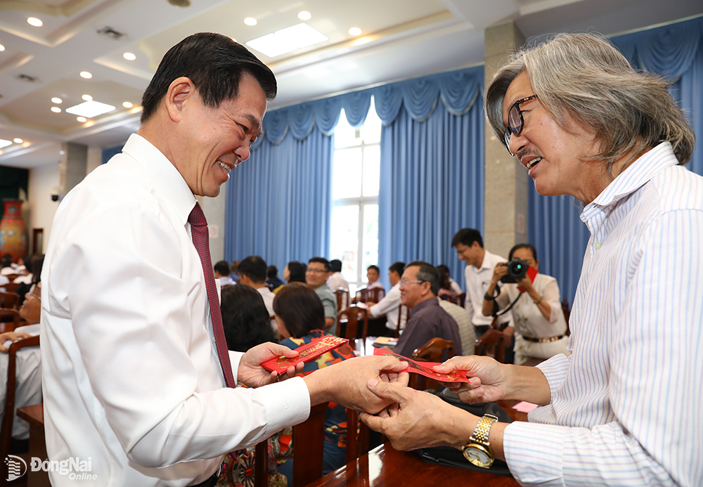 | Bí thư Tỉnh ủy Nguyễn Hồng Lĩnh lì xì đầu năm cho các văn nghệ sĩ, trí thức tại buổi gặp mặt |