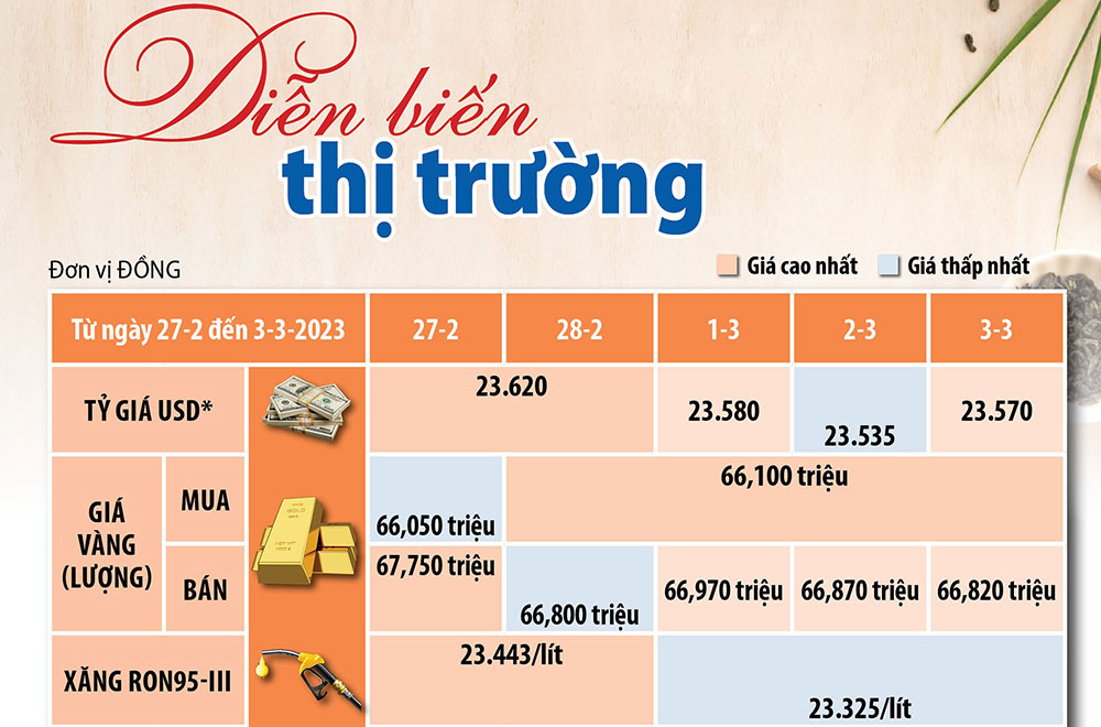 Trong khi đó, diễn biến đồng USD có nhiều sôi động ở cả chiều mua và bán. Giá đồng USD niêm yết tại Vietcombank ngày 3-3 ở chiều mua vào là 23.550 đồng và bán ra là 23.890 đồng.
