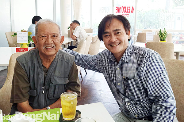 | Nhà thơ Phan Hoàng, Phó chủ tịch Hội Nhà văn TP.Hồ Chí Minh chúc mừng nhà văn - nghệ sĩ Mạc Can “tái xuất” sau tai nạn. Ảnh: N.Việt |