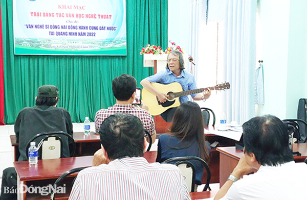 | Nhạc sĩ Cao Hồng Sơn biểu diễn ca khúc tham gia trại sáng tác văn học nghệ thuật chủ đề Văn nghệ sĩ Đồng Nai đồng hành cùng đất nước năm 2022. Ảnh: L.Na |